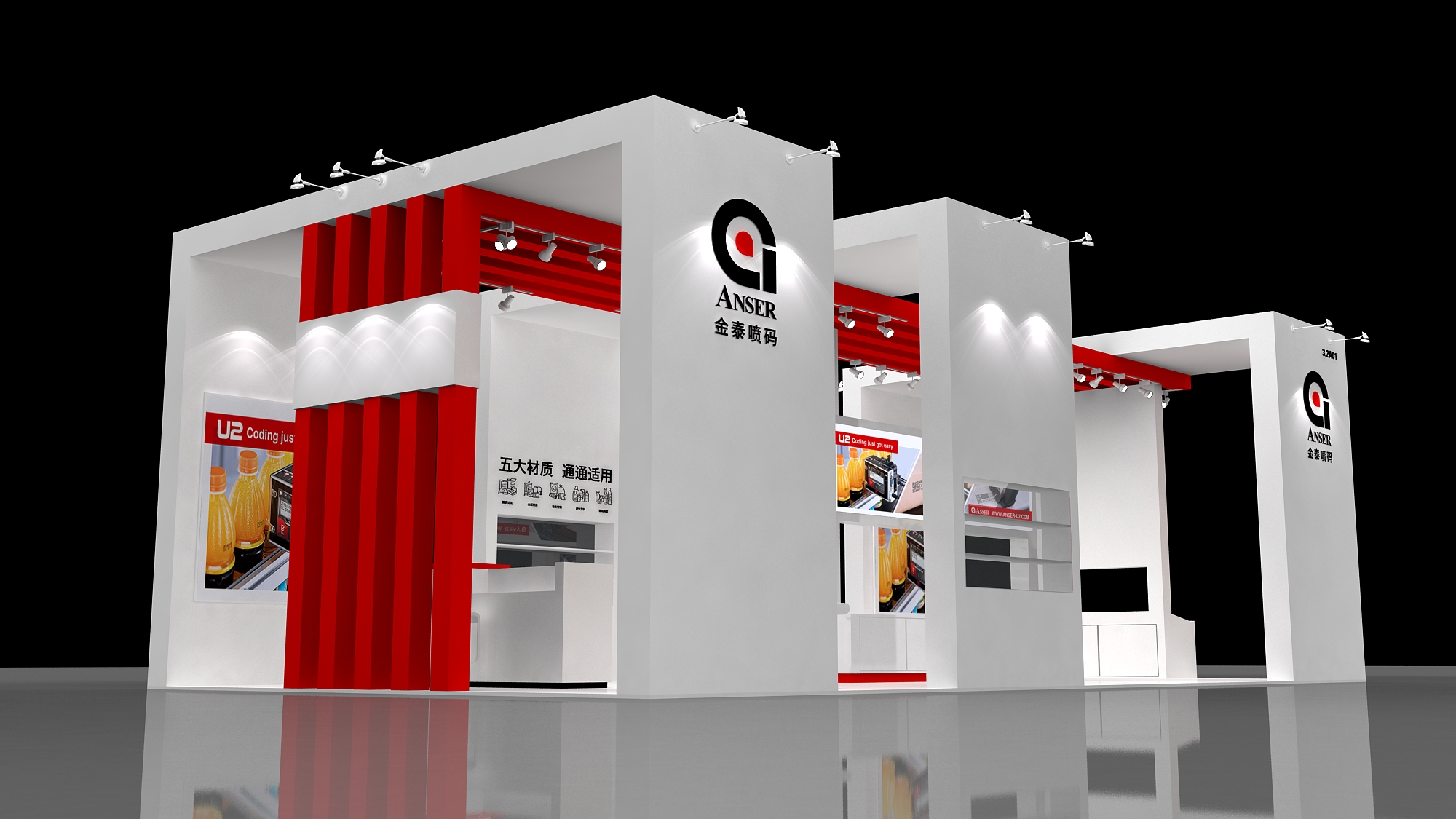 契合金泰噴碼品牌形象和產(chǎn)品特性,采用開放式的效果,再搭配燈具燈光的效果,襯托出展位現(xiàn)代、突出一種現(xiàn)代、高端的時(shí)尚品味。
