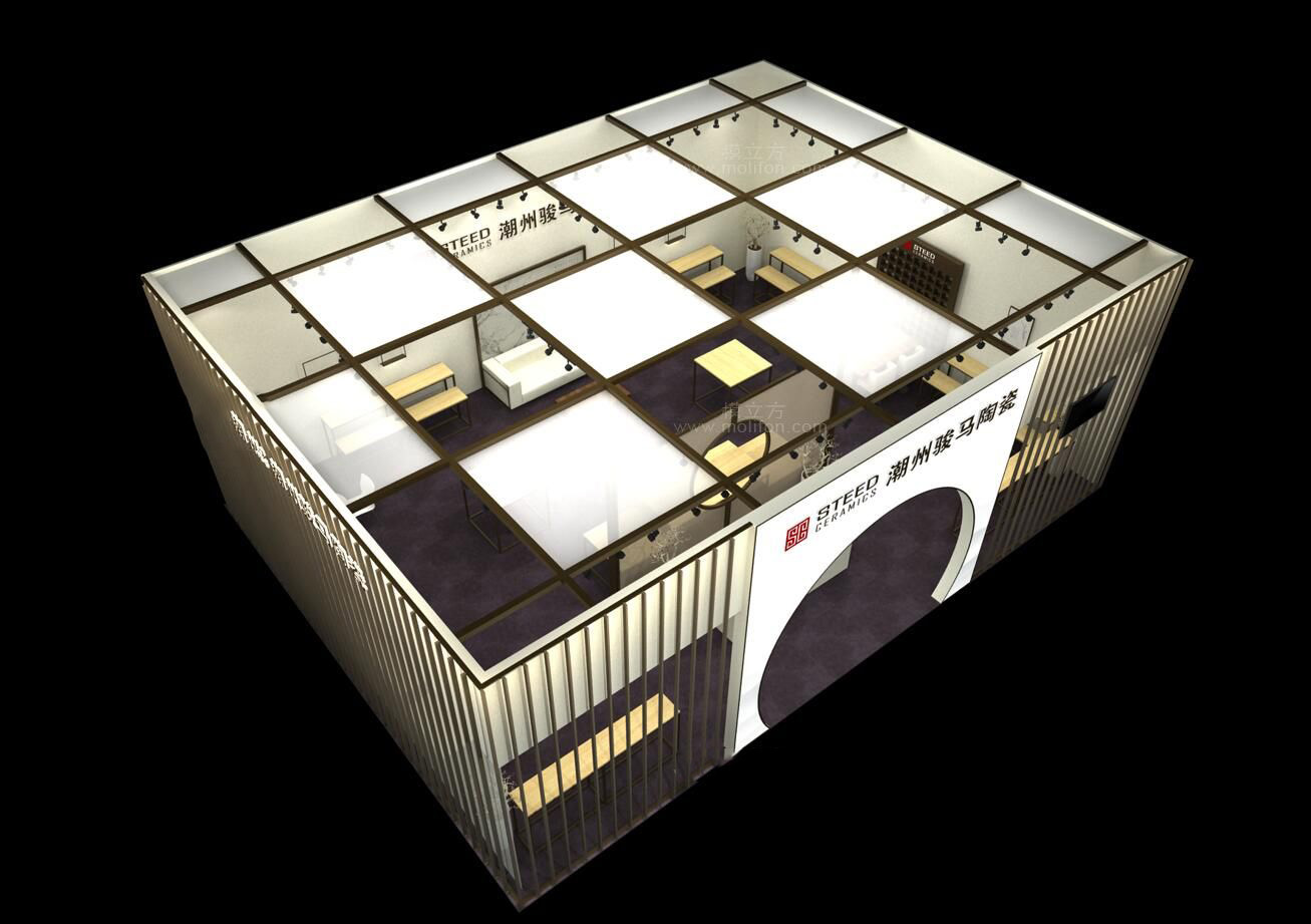 契合駿馬陶瓷的品牌形象和產(chǎn)品特性,采用矩形結(jié)構(gòu),再搭配燈具燈光的效果,襯托出展位大氣、豪華的氛圍,突出一種簡約、時(shí)尚的品味。