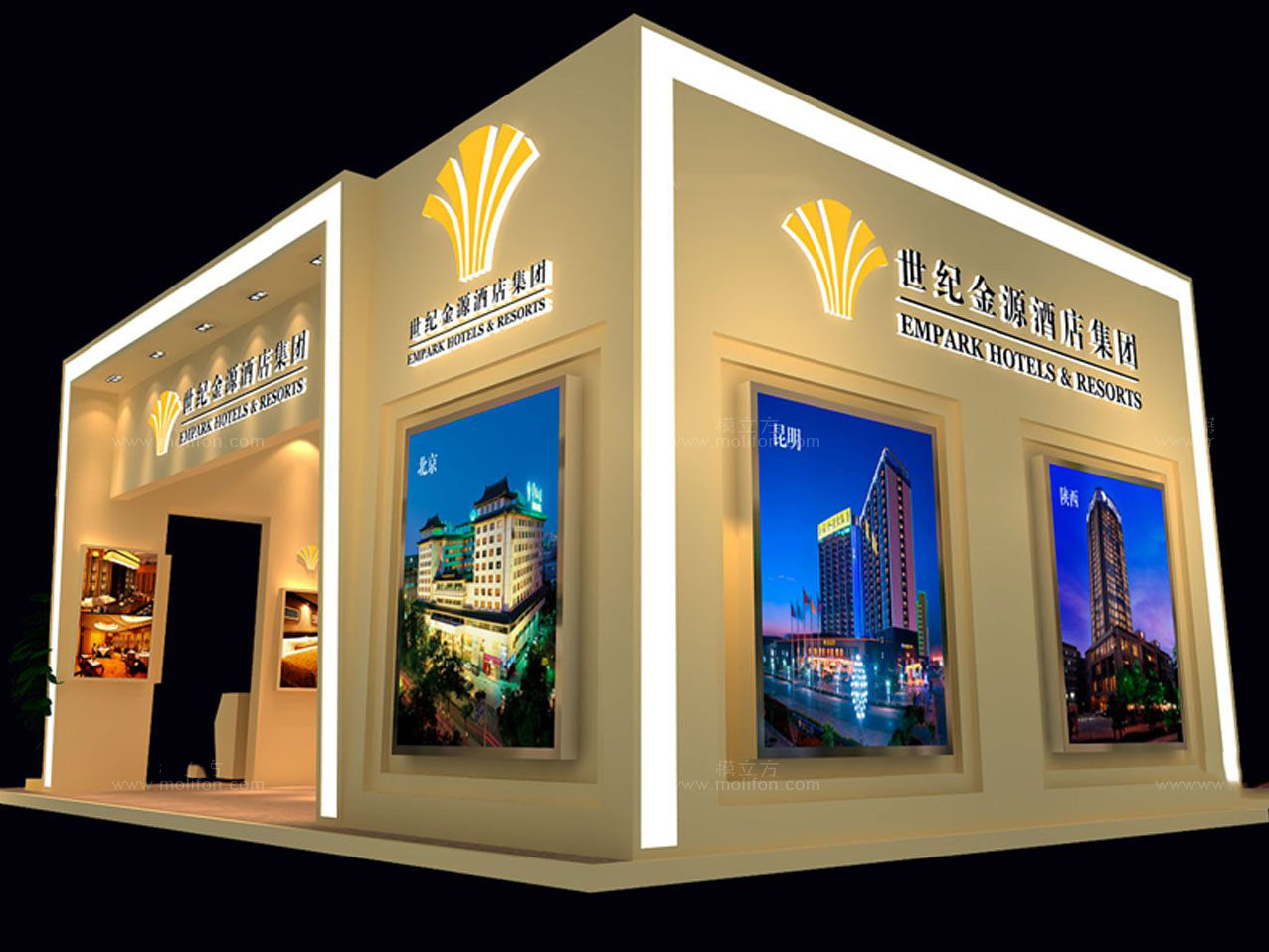 契合世紀(jì)金源的品牌形象和產(chǎn)品特性,采用矩形結(jié)構(gòu),再搭配燈具燈光的效果,襯托出展位大氣、豪華的氛圍,突出一種簡(jiǎn)約、時(shí)尚的品味。