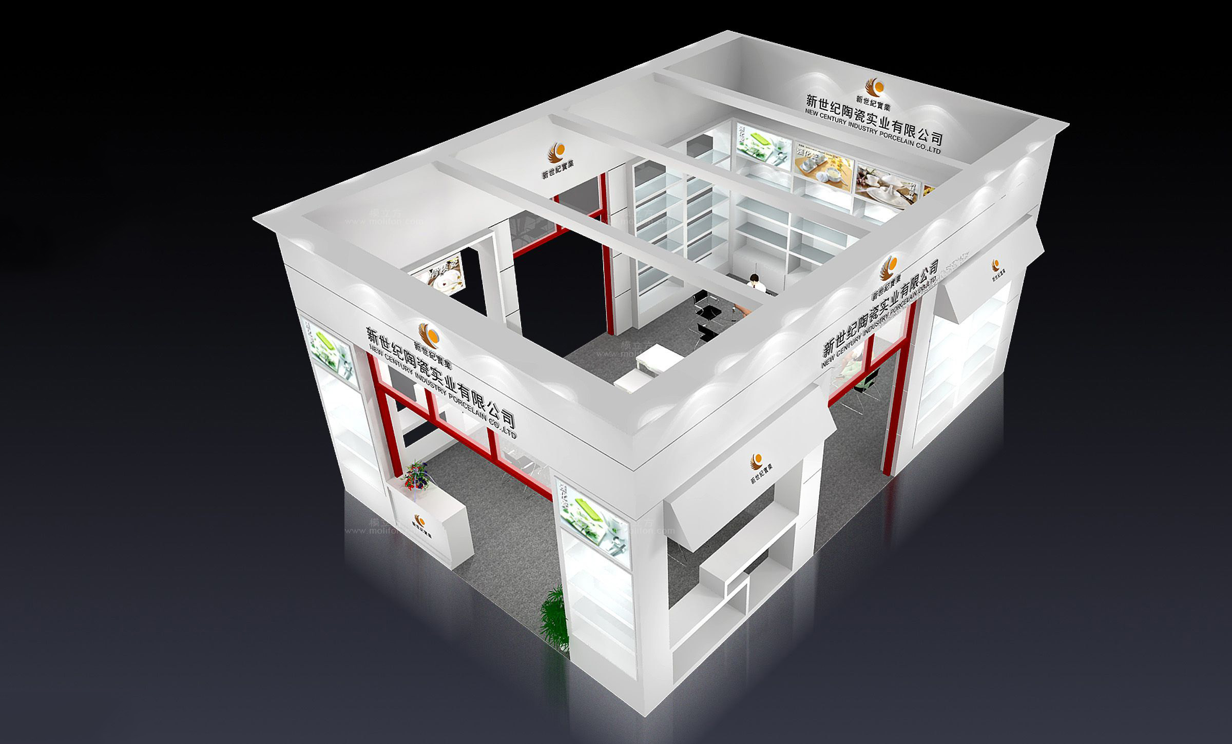 契合世紀(jì)新世紀(jì)陶瓷的品牌形象和產(chǎn)品特性,采用矩形結(jié)構(gòu),再搭配燈具燈光的效果,襯托出展位大氣、豪華的氛圍,突出一種簡約、時(shí)尚的品味。
