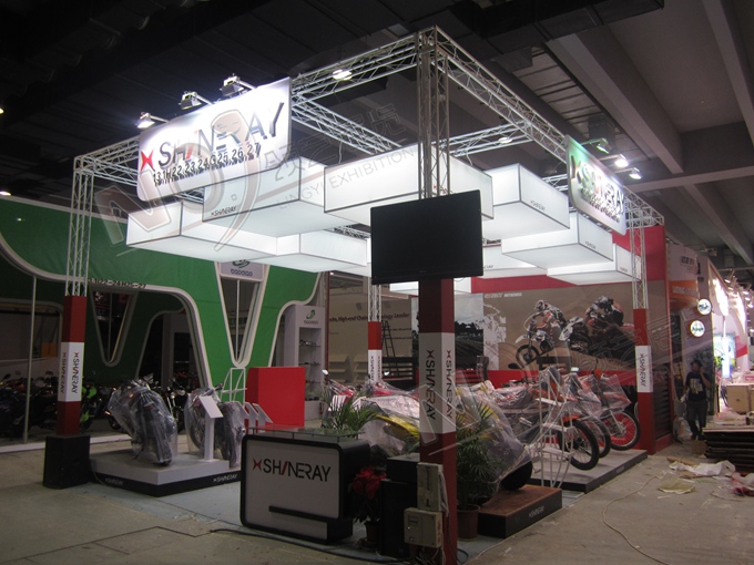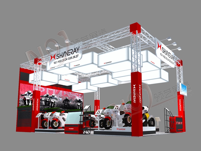 契合鑫源摩托的品牌形象和產(chǎn)品特性,采用矩形結(jié)構,再搭配燈具燈光的效果,襯托出展位簡約、時尚的氛圍,突出一種現(xiàn)代、簡約的時尚品味。