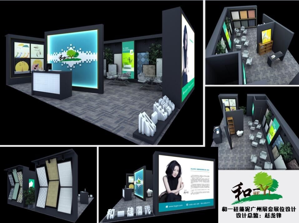 契合和一硅藻泥的品牌形象和產(chǎn)品特性,利用黑色突出產(chǎn)品,再搭配燈具燈光的效果,襯托出展位現(xiàn)代、突出一種現(xiàn)代、高端的時(shí)尚品味。
