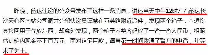 2月18日中午,長沙市洞井安置小區(qū)韻達(dá)快遞的員工譚慧在雨花區(qū)萬芙路長安郡小區(qū)二期門前馬路邊撿到一疊現(xiàn)金,給同在一個(gè)公司上班的堂哥譚某勝打電話開玩笑說撿到兩箱錢,估計(jì)有幾百萬。堂哥讓譚慧報(bào)警,但譚慧并沒有報(bào)警,也未告知真相,而是原地等待失主十分鐘左右后離開,去往洞井一小區(qū)與譚某勝匯合,并拿出撿到錢說是失主給的感謝費(fèi)。經(jīng)清點(diǎn),發(fā)現(xiàn)有1000元錢。當(dāng)日下午,公司負(fù)責(zé)人之一陳某找其核實(shí)情況,并要求他問清處警的民警姓名,于是譚慧撥打110,但未說話。后來,因?yàn)槊孀右蛩睾蛽?dān)心被責(zé)怪一直沒說出實(shí)情,還編造出撿到四、五百萬并報(bào)警,有疑似特警人員處警辦理此事,并以此答復(fù)媒體。