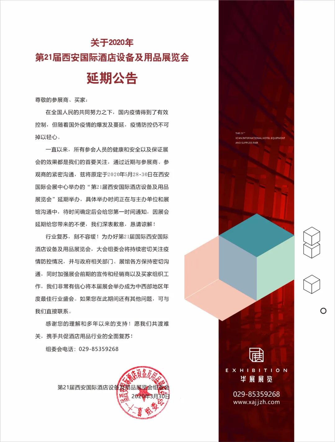 根據(jù)酒店用品展設(shè)計搭建公司領(lǐng)藝展覽了解到,2020年西安國際酒店用品展將延期舉辦。如需酒店用品展設(shè)計請聯(lián)系領(lǐng)藝展覽,希望我們能在酒店用品展搭建上為您添磚加瓦,祝各位朋友收獲多多,滿載而歸!