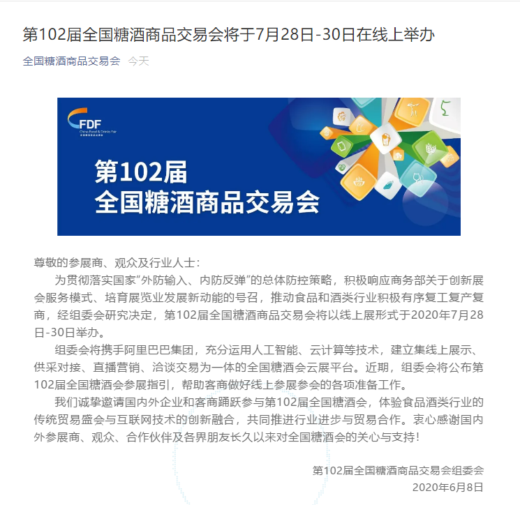 糖酒會設(shè)計搭建公司領(lǐng)藝展覽了解到,為貫徹落實國家“外防輸入、內(nèi)防反彈”的總體防控策略,積極響應(yīng)商務(wù)部關(guān)于創(chuàng)新展會服務(wù)模式、培育展覽業(yè)發(fā)展新動能的號召,推動食品和酒類行業(yè)積極有序復(fù)工復(fù)產(chǎn)復(fù)商,經(jīng)組委會研究決定,第102屆全國糖酒商品交易會將以線上展形式于2020年7月28日-30日舉辦。如需展會設(shè)計請聯(lián)系領(lǐng)藝展覽,希望我們能在展會搭建上為您添磚加瓦,祝各位朋友收獲多多,滿載而歸!