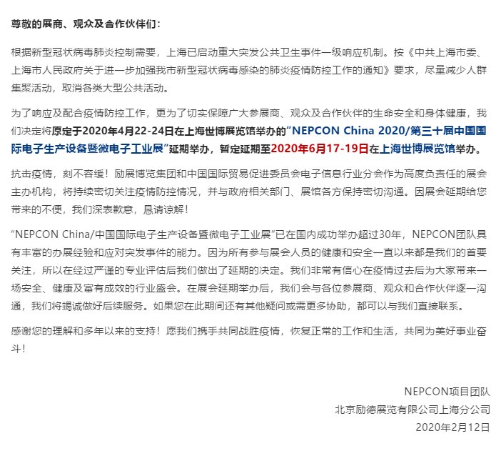 根據(jù)上海電子展設(shè)計搭建公司領(lǐng)藝展覽解到為了響應及配合疫情防控工作,更為了切實保障廣大參展商、觀眾及合作伙伴的生命安全和身體健康,我們決定將原定于2020年4月22-24日在上海世博展覽館舉辦的“NEPCON China 2020/第三十屆中國國際電子生產(chǎn)設(shè)備暨微電子工業(yè)展”延期舉辦,暫定延期至2020年6月17-19日在上海世博展覽館舉辦。領(lǐng)藝展覽為您上海電子展設(shè)計搭建保駕護航。