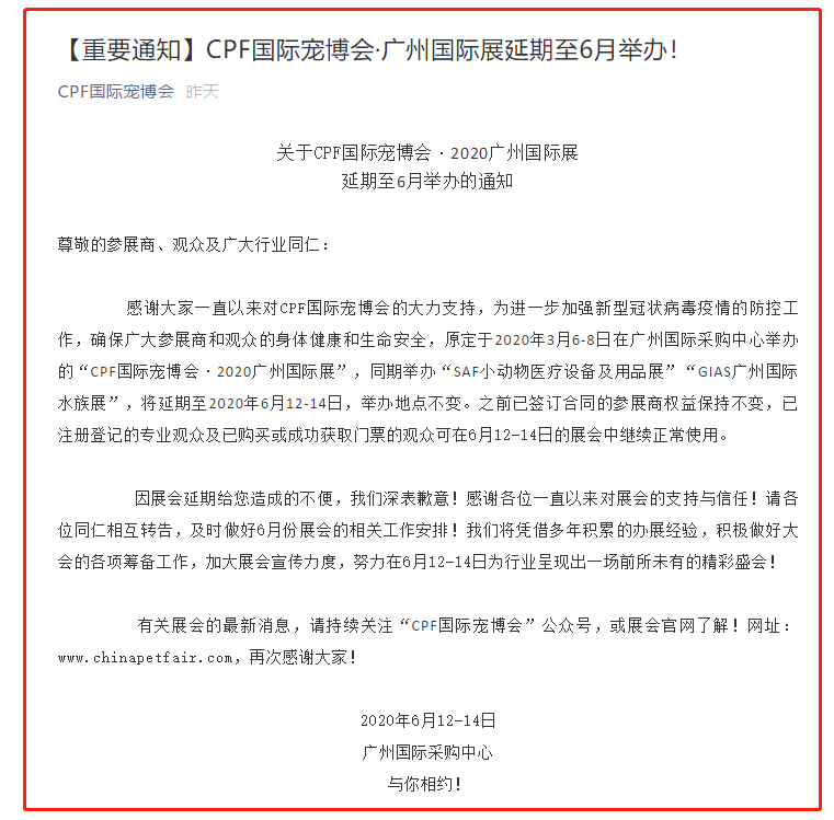 根據(jù)CPF寵博會設(shè)計搭建公司領(lǐng)藝展覽了解到,為進一步加強新型冠狀病毒疫情的防控工作,確保廣大參展商和觀眾的身體健康和生命安全,原定于2020年3月6-8日在廣州國際采購中心舉辦的“CPF國際寵博會·2020廣州國際展”,同期舉辦“SAF小動物醫(yī)療設(shè)備及用品展”“GIAS廣州國際水族展”,將延期至2020年6月12-14日,舉辦地點不變。如需廣州寵博會設(shè)計請聯(lián)系領(lǐng)藝展覽,希望我們能在寵物展搭建上為您添磚加瓦,祝各位朋友收獲多多,滿載而歸!