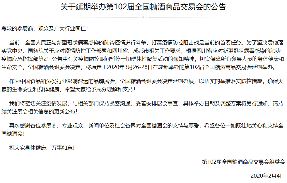 當(dāng)前,全國(guó)人民正與新型冠狀病毒感染的肺炎疫情進(jìn)行斗爭(zhēng),打贏疫情防控阻擊戰(zhàn)是當(dāng)前的首要任務(wù)。為了堅(jiān)決貫徹落實(shí)黨中央、國(guó)務(wù)院關(guān)于應(yīng)對(duì)疫情防控工作部署和四川省、成都市相關(guān)工作要求,根據(jù)四川省應(yīng)對(duì)新型冠狀病毒感染的肺炎疫情應(yīng)急指揮部第2號(hào)公告中有關(guān)疫情防控期間暫停一切群體性聚集活動(dòng)的通知精神,切實(shí)保障所有參展人員的身體健康和生命安全,全國(guó)糖酒會(huì)組委會(huì)決定,將原定于2020年3月26-28日在成都舉辦的第102屆全國(guó)糖酒商品交易會(huì)延期舉辦。如需成都糖酒展設(shè)計(jì)請(qǐng)聯(lián)系領(lǐng)藝展覽,希望我們能在成都糖酒展搭建上為您添磚加瓦,祝各位朋友收獲多多,滿(mǎn)載而歸!