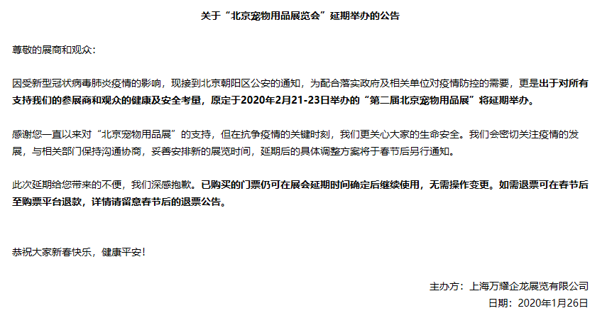 根據(jù)北京寵物展設(shè)計(jì)搭建公司領(lǐng)藝展覽了解到,因受新型冠狀病毒肺炎疫情的影響,主辦方為配合落實(shí)政府及相關(guān)單位對疫情防控的需要,更是出于對所有支持我們的參展商和觀眾的健康及安全考量,原定于2020年2月21-23日舉辦的“第二屆北京寵物用品展”將延期舉辦。如需北京寵物展設(shè)計(jì)請聯(lián)系領(lǐng)藝展覽,希望我們能在北京寵物展搭建上為您添磚加瓦,祝各位朋友收獲多多,滿載而歸!