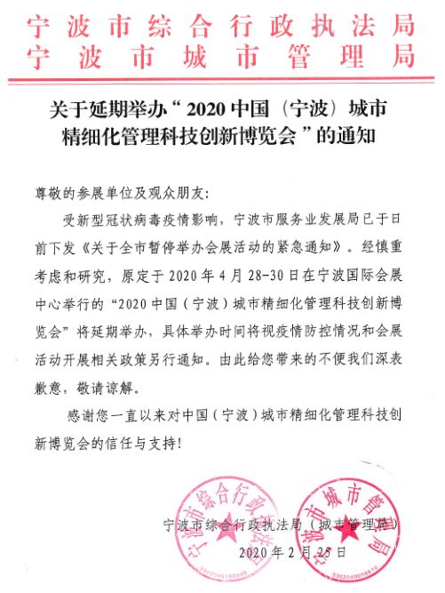 根據(jù)展臺(tái)設(shè)計(jì)搭建公司領(lǐng)藝展覽了解到,2020中國(寧波)城市精細(xì)化管理科技創(chuàng)新博覽會(huì)將延期舉辦。如需展臺(tái)設(shè)計(jì)請(qǐng)聯(lián)系領(lǐng)藝展覽,希望我們能在展位搭建上為您添磚加瓦,祝各位朋友收獲多多,滿載而歸!