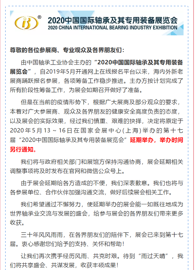 根據(jù)軸承展設(shè)計(jì)搭建公司領(lǐng)藝展覽了解到,原定于2020年5月13~16日在國(guó)家會(huì)展中心(上海)舉辦的第十七屆“2020中國(guó)國(guó)際軸承及其專用裝備展覽會(huì)”延期舉辦,舉辦時(shí)間另行通知。如需軸承展設(shè)計(jì)請(qǐng)聯(lián)系領(lǐng)藝展覽,希望我們能在軸承展搭建上為您添磚加瓦,祝各位朋友收獲多多,滿載而歸!