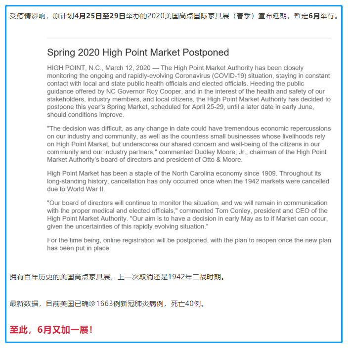 根據(jù)家具展設計搭建公司領藝展覽了解到,受疫情影響,原計劃4月25日至29日舉辦的2020美國高點國際家具展(春季)宣布延期,暫定6月舉行。如需家具展設計請聯(lián)系領藝展覽,希望我們能在家具展搭建上為您添磚加瓦,祝各位朋友收獲多多,滿載而歸!