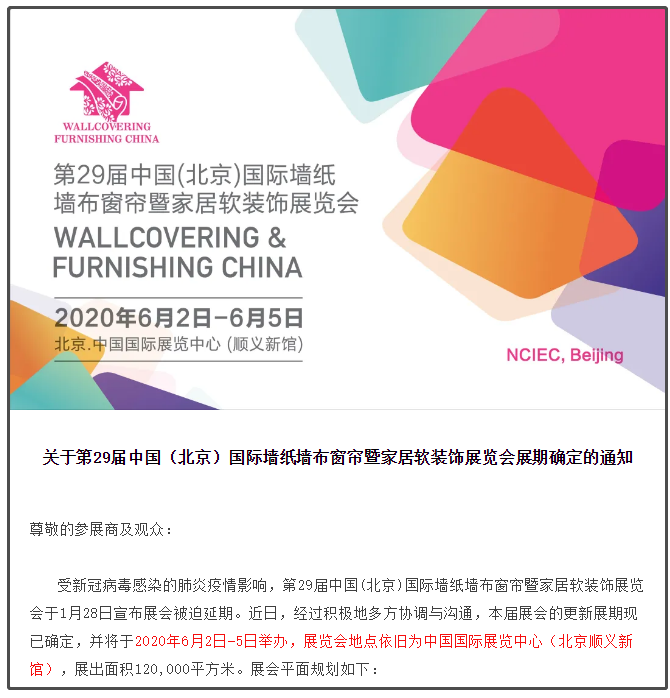 根據(jù)北京展會設(shè)計(jì)搭建公司領(lǐng)藝展覽了解到,受新冠病毒感染的肺炎疫情影響,第29屆中國(北京)國際墻紙墻布窗簾暨家居軟裝飾展覽會于1月28日宣布展會被迫延期。近日,經(jīng)過積極地多方協(xié)調(diào)與溝通,本屆展會的更新展期現(xiàn)已確定,并將于2020年6月2日-5日舉辦,展覽會地點(diǎn)依舊為中國國際展覽中心(北京順義新館),展出面積120,000平方米。如需北京展會設(shè)計(jì)請聯(lián)系領(lǐng)藝展覽,希望我們能在北京展會搭建上為您添磚加瓦,祝各位朋友收獲多多,滿載而歸!