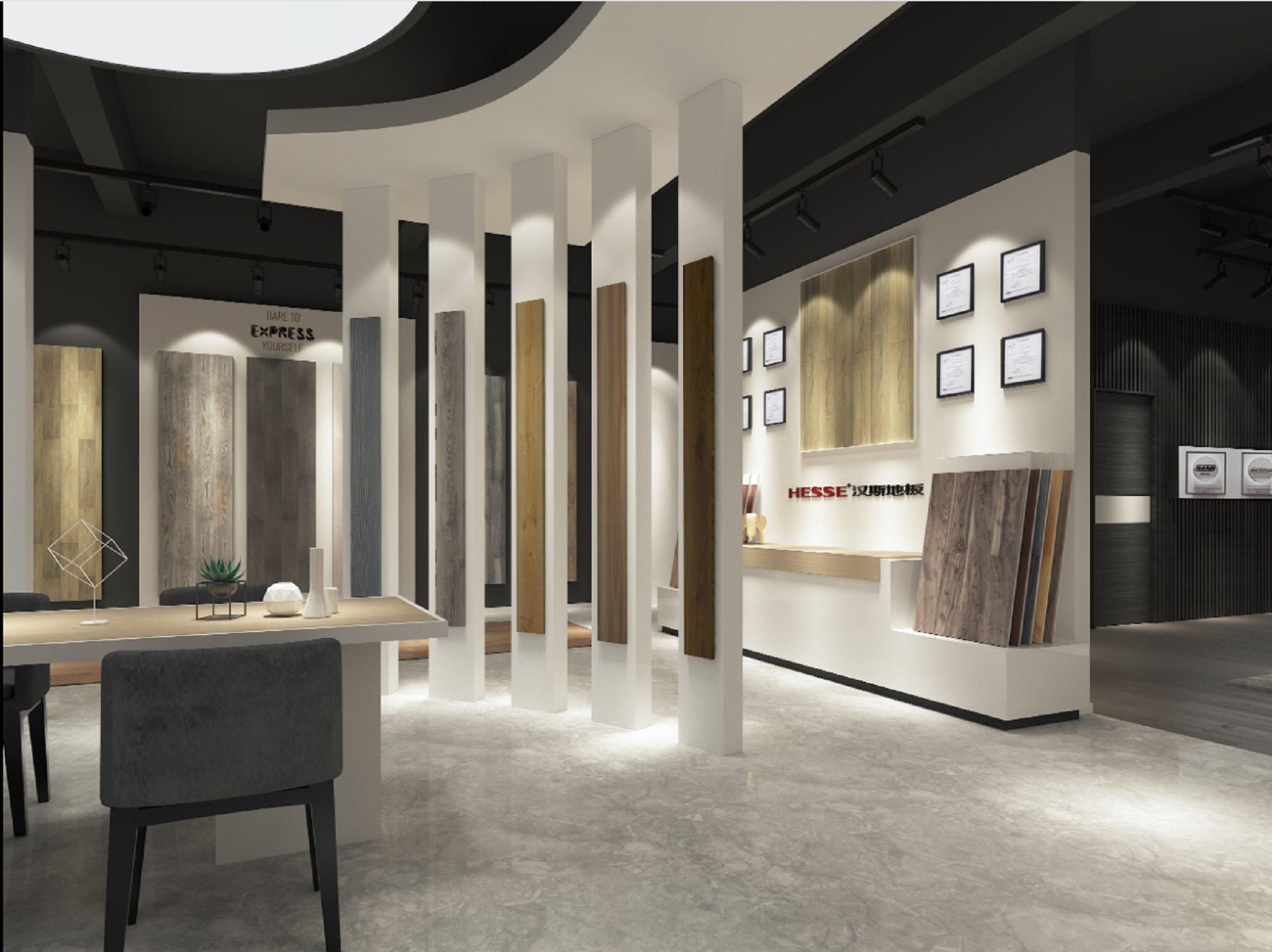 契合漢斯地板的品牌形象和產(chǎn)品特性,采用開放式結(jié)構(gòu)進行合理的分區(qū),再搭配燈具燈光的效果,襯托出展廳大氣、豪華的氛圍,突出一種簡約、時尚的品味。