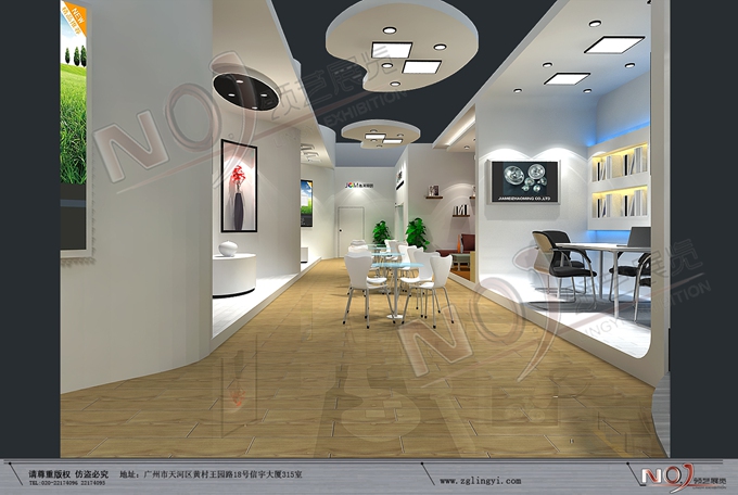 契合嘉美的品牌形象和產(chǎn)品特性,采用弧形、矩形結構,再搭配燈具燈光的效果,襯托出展位時尚、簡約的氛圍,突出一種現(xiàn)代、活力的時尚品味。