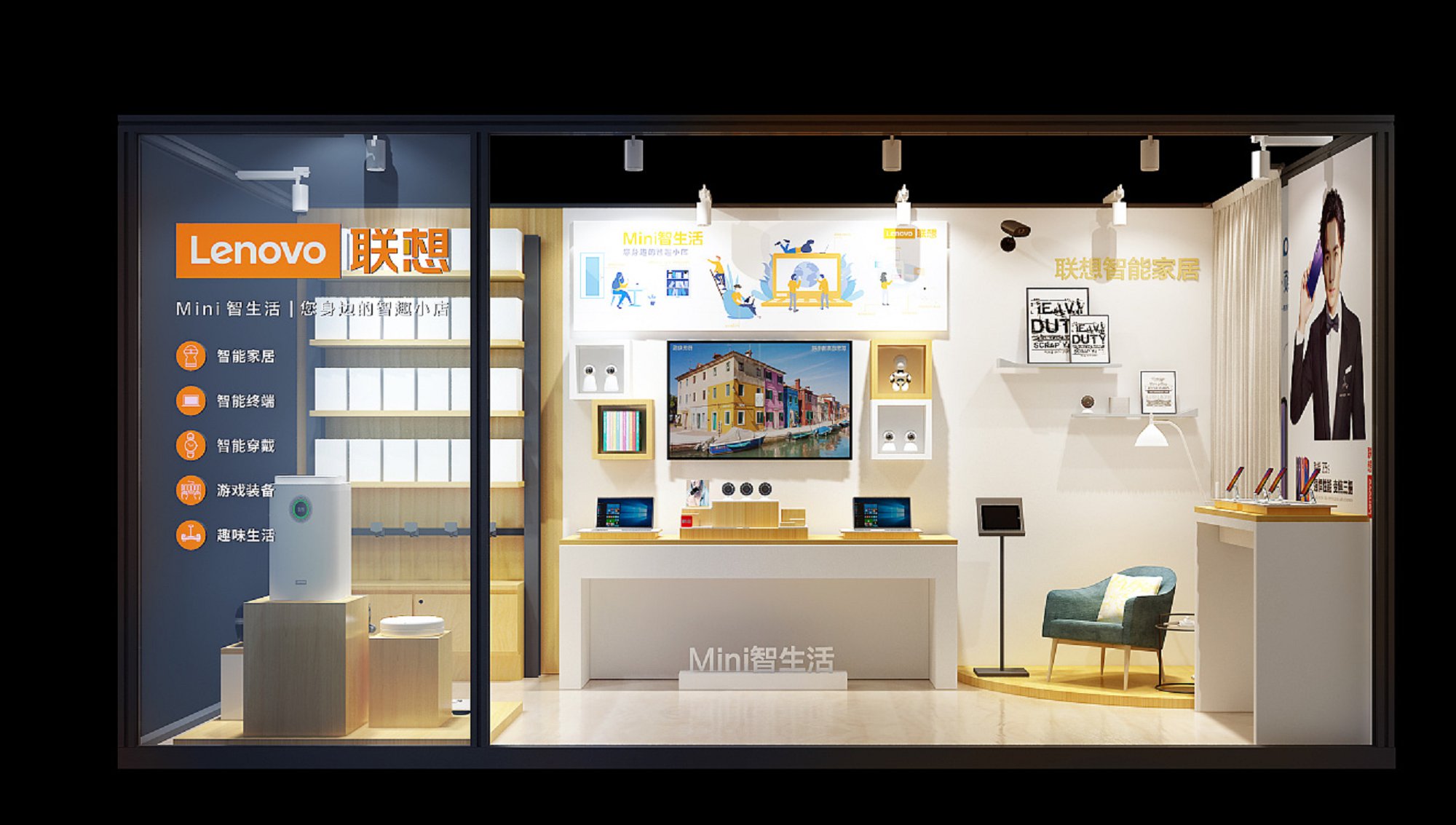 契合聯(lián)想的品牌形象和產(chǎn)品特性,采用開放式結(jié)構(gòu)進(jìn)行合理的分區(qū),再搭配燈具燈光的效果,襯托出直播間大氣、豪華的氛圍,突出一種簡約、時尚的品味。